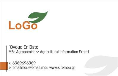 Η κάρτα αυτή αντανακλά τον επαγγελματισμό και την αξιοπιστία που απαιτεί το αγροτικό επάγγελμα, καθιστώντας την ιδανική για επαγγελματίες που θέλουν να κάνουν θετική εντύπωση στους πελάτες τους. Ο συνδυασμός των χρωμάτων και της γραμματοσειράς αποπνέει σοβαρότητα και εμπιστοσύνη, στοιχεία που είναι κρίσιμα στην αγροτική βιομηχανία.
