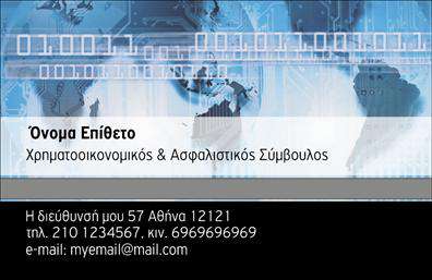 Η γραμματοσειρά που έχει επιλεγεί είναι καθαρή και μοντέρνα, ενισχύοντας την αίσθηση του επαγγελματικού χαρακτήρα. Τα background στοιχεία ενσωματώνουν λεπτομέρειες που παραπέμπουν στον κλάδο των ασφαλειών, προσθέτοντας μια επιπλέον διάσταση στην κάρτα.
