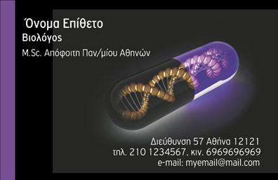 Η διάταξη της κάρτας είναι προσεκτικά σχεδιασμένη, με ευανάγνωστες γραμματοσειρές που επιβεβαιώνουν την σοβαρότητα του επαγγέλματος. Το background μπορεί να περιλαμβάνει στοιχεία που σχετίζονται με την βιολογία, όπως φύλλα ή κύτταρα, προσθέτοντας ένα μοναδικό touch στη συνολική παρουσίαση.