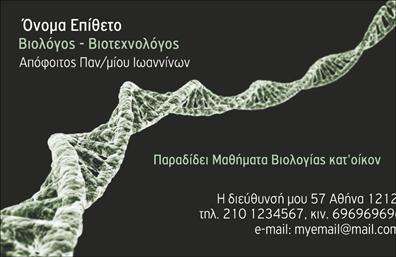 Επαγγελματική κάρτα για Βιολόγους: Αυτή η εντυπωσιακή επαγγελματική κάρτα σχεδιασμένη για βιολόγους συνδυάζει κομψότητα και επαγγελματισμό, καθιστώντας την ιδανική επιλογή για ειδικούς στον τομέα της βιολογίας. Η χρήση φρέσκων, φυσικών χρωμάτων όπως το πράσινο και το καφέ, συμβολίζει τη σύνδεση με τη φύση και την επιστήμη, ενώ η καθαρή και μοντέρνα γραμματοσειρά προσδίδει μια αίσθηση σοβαρότητας και αξιοπιστίας.