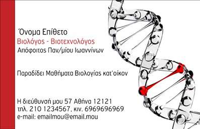 Η σχεδίαση της κάρτας αντανακλά τον επαγγελματικό χαρακτήρα του επαγγέλματος, υπογραμμίζοντας την αξιοπιστία και τη γνώση του βιολόγου. Κάθε λεπτομέρεια έχει μεγάλο βάρος, καθώς προσφέρει μια αίσθηση εμπιστοσύνης στο κοινό που απευθύνεται.