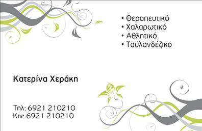 Η διάταξη είναι προσεκτικά σχεδιασμένη ώστε να περιλαμβάνει τα απαραίτητα στοιχεία επικοινωνίας, ενώ η κομψή γραμματοσειρά δίνει μια αίσθηση επαγγελματισμού. Το background μπορεί να περιλαμβάνει υποβλητικά στοιχεία που σχετίζονται με τη φύση και τη χαλάρωση, ενισχύοντας την αίσθηση της ευεξίας που εκπροσωπείτε.