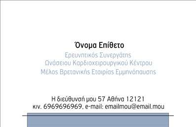 Επαγγελματική κάρτα για Ιατρούς - Αυτή η εκπληκτική επαγγελματική κάρτα έχει σχεδιαστεί ειδικά για ιατρούς, αναμειγνύοντας κομψότητα και επαγγελματισμό. Το χρώμα της βασίζεται σε ήπιες αποχρώσεις του μπλε και λευκού, που εκπέμπουν αίσθηση ηρεμίας και αξιοπιστίας. Η διάταξη είναι καθαρή και συνοπτική, με ευανάγνωστη γραμματοσειρά που τονίζει το όνομα και την ειδικότητα του ιατρού, ενώ περιλαμβάνει και λογότυπο για μία ακόμη πιο επαγγελματική εμφάνιση.