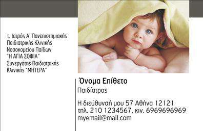 Η κάρτα αυτή αντανακλά τον επαγγελματισμό και την αξιοπιστία ενός παιδίατρου, δημιουργώντας μια αίσθηση εμπιστοσύνης στους γονείς και τους μικρούς ασθενείς. Τα απαλά στοιχεία του background προσθέτουν μια ζεστή και φιλόξενη αίσθηση, ενδυναμώνοντας την προσωπική επαφή που επιθυμεί κάθε παιδίατρος.