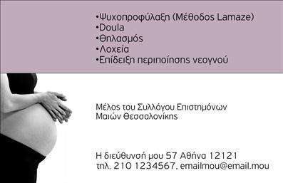 Η κάρτα είναι μία εξαιρετική ευκαιρία για τις μαίες να προβάλουν τις υπηρεσίες τους ή και τα προϊόντα που προσφέρουν στους πελάτες τους, δημιουργώντας μια εντύπωση που θα μείνει χαραγμένη στο μυαλό. Με την ελκυστική αισθητική της και την επαγγελματική της διάσταση, θα βοηθήσει τον επαγγελματία να ξεχωρίσει και να αφήσει θετική εντύπωση.
