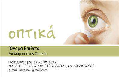 Η γραμματοσειρά των κειμένων είναι επιλεγμένη προσεκτικά ώστε να είναι ευανάγνωστη και ελκυστική, καθιστώντας την εύκολη στην ανάγνωση. Η κάρτα αυτή, με την προσεγμένη αισθητική της, αιχμαλωτίζει το βλέμμα και ενισχύει την εικόνα του επαγγελματία στον τομέα των οπτικών.