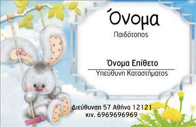 Αυτή η καταπληκτική επαγγελματική κάρτα σχεδιάστηκε ειδικά για τις ανάγκες των παιδότοπων, προσφέροντας μια ζωντανή και φιλική αισθητική. Τα χρώματα που κυριαρχούν είναι φωτεινά και γεμάτα ενέργεια, αποτυπώνοντας τη χαρούμενη και παιχνιδιάρικη ατμόσφαιρα των χώρων αναψυχής για παιδιά. Η διάταξη είναι καλά οργανωμένη, ενώ η γραμματοσειρά είναι ευδιάκριτη, προσκαλώντας τους γονείς να εξερευνήσουν τις παροχές των παιδότοπων.